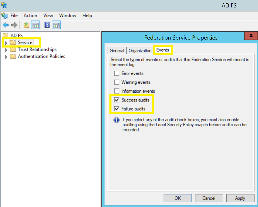 Log in to the AD FS server with Domain Admin credentials. Open the AD FS management console, right-click Service > Edit Federation Service Properties > Events.