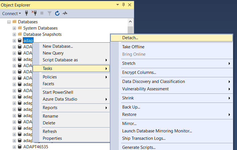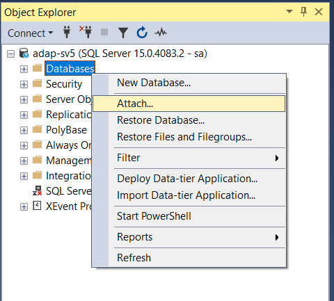 For example, the path for 2019 SQL Server with Instance_Name or Service_Name as MSSQLSERVER: C:\Program Files\Microsoft SQL Server\MSSQL15.MSSQLSERVER\MSSQL\DATA) → Copy the .mdf and .LDF files (For example: adap.mdf and adap_log.LDF).