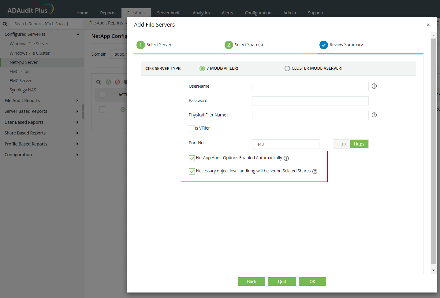 To configure object-level auditing automatically, ensure that the box next to Necessary object level auditing will be set on Selected Shares is checked. Alternatively, you can follow the manual configuration steps in the next section.