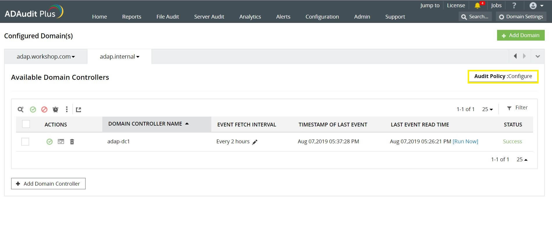 OverviewQuick start System requirementsQuick start PrerequisitesQuick start Deploying ADAudit PlusQuick start Configure components in ADAudit PlusQuick start Related documentationQuick start OverviewActive Directory > Active Directory auditing Configure AD domains and DCs - Automatic configurationActive Directory > Active Directory auditing Configure AD domains and DCs - Manual configurationActive Directory > Active Directory auditing Configure audit policies - Automatic configurationActive Directory > Active Directory auditing Configure audit policies - Manual configurationActive Directory > Active Directory auditing Configure object level auditing - Automatic configurationActive Directory > Active Directory auditing Configure object level auditing - Manual configurationActive Directory > Active Directory auditing Configure event log settingsActive Directory > Active Directory auditing TroubleshootingActive Directory > Active Directory auditing OverviewWindows Server > Removable storage auditing Configure USB AuditingWindows Server > Removable storage auditing TroubleshootingWindows Server > Removable storage auditing OverviewFile Server > Windows file server Supported systemsFile Server > Windows file server Configure Windows file servers - One server at a timeFile Server > Windows file server Configure Windows file servers - In bulkFile Server > Windows file server Configure audit policies - Automatic configurationFile Server > Windows file server Configure audit policies - Manual configurationFile Server > Windows file server Configure object-level auditing - Automatic configurationFile Server > Windows file server Configure object-level auditing - Manual configurationFile Server > Windows file server Configure object-level auditing - Using PowerShell cmdletsFile Server > Windows file server Configure event log settingsFile Server > Windows file server Exclude configurationFile Server > Windows file server File AnalysisFile Server > Windows file server TroubleshootingFile Server > Windows file server OverviewFile Server > EMC server auditing Privileges requiredFile Server > EMC server auditing Adding EMC serversFile Server > EMC server auditing Configure audit policiesFile Server > EMC server auditing Configure event log settingsFile Server > EMC server auditing Automatic configurationFile Server > EMC server auditing Manual configurationFile Server > EMC server auditing Exclusion configurationFile Server > EMC server auditing TroubleshootingFile Server > EMC server auditing OverviewWindows Server > Windows Server Auditing Using product consoleWindows Server > Windows Server Auditing Using command line argumentsWindows Server > Windows Server Auditing Configure audit policies automaticallyWindows Server > Windows Server Auditing Configure audit policies manuallyWindows Server > Windows Server Auditing Remove Apply Group Policy privilege for Authenticated UsersWindows Server > Windows Server Auditing Create a new group, add all Windows servers to the group, and link a GPO to the groupWindows Server > Windows Server Auditing Configure advanced audit policiesWindows Server > Windows Server Auditing Force advanced audit policiesWindows Server > Windows Server Auditing Configure legacy audit policiesWindows Server > Windows Server Auditing Configure event log settingsWindows Server > Windows Server Auditing TroubleshootingWindows Server > Windows Server Auditing OverviewActive Directory > Group policy object auditing Benefits of auditing Group Policy Objects using ADAudit PlusActive Directory > Group policy object auditing Configure domain controllersActive Directory > Group policy object auditing Configure audit controllers - Automatic processActive Directory > Group policy object auditing Configure audit controllers - Manual processActive Directory > Group policy object auditing Configure Object-level auditong - Automatic processActive Directory > Group policy object auditing Configure Object-level auditong - Manual processActive Directory > Group policy object auditing Configure event log settingsActive Directory > Group policy object auditing Install the Group Policy Management ConsoleActive Directory > Group policy object auditing OverviewActive Directory > ADFS auditing Configure AD FS servers in ADAudit PlusActive Directory > ADFS auditing Configure audit policies - Automatic configurationActive Directory > ADFS auditing Configure audit policies - Manual configurationActive Directory > ADFS auditing Configure AD FS servers for auditing - Enable auditingActive Directory > ADFS auditing Configure AD FS servers for auditing - Configure claimsActive Directory > ADFS auditing Configure AD FS servers for auditing - Configure extranet lockoutActive Directory > ADFS auditing TroubleshootingActive Directory > ADFS auditing OverviewWindows workstation auditing Configuring windows workstations - Using product consoleWindows workstation auditing Configuring windows workstations - Using command ine argumentsWindows workstation auditing Configuring audit policies - Automatic ProcessWindows workstation auditing Configuring audit policies - Manual ProcessWindows workstation auditing Configuring event log settingsWindows workstation auditing TroubleshootingWindows workstation auditing OverviewWindows Server > File integrity monitoring Configure FIM in ADAudit PlusWindows Server > File integrity monitoring Configure audit policies - Automatic configurationWindows Server > File integrity monitoring Configure audit policies - Manual configurationWindows Server > File integrity monitoring Configure object-level auditing - Using Windows sharesWindows Server > File integrity monitoring Configure object-level auditing - Using PowerShell cmdletsWindows Server > File integrity monitoring Configure object-level auditing - Using Global Object Access Auditing settingsWindows Server > File integrity monitoring Exclude configurationWindows Server > File integrity monitoring Configuring event log settingsWindows 