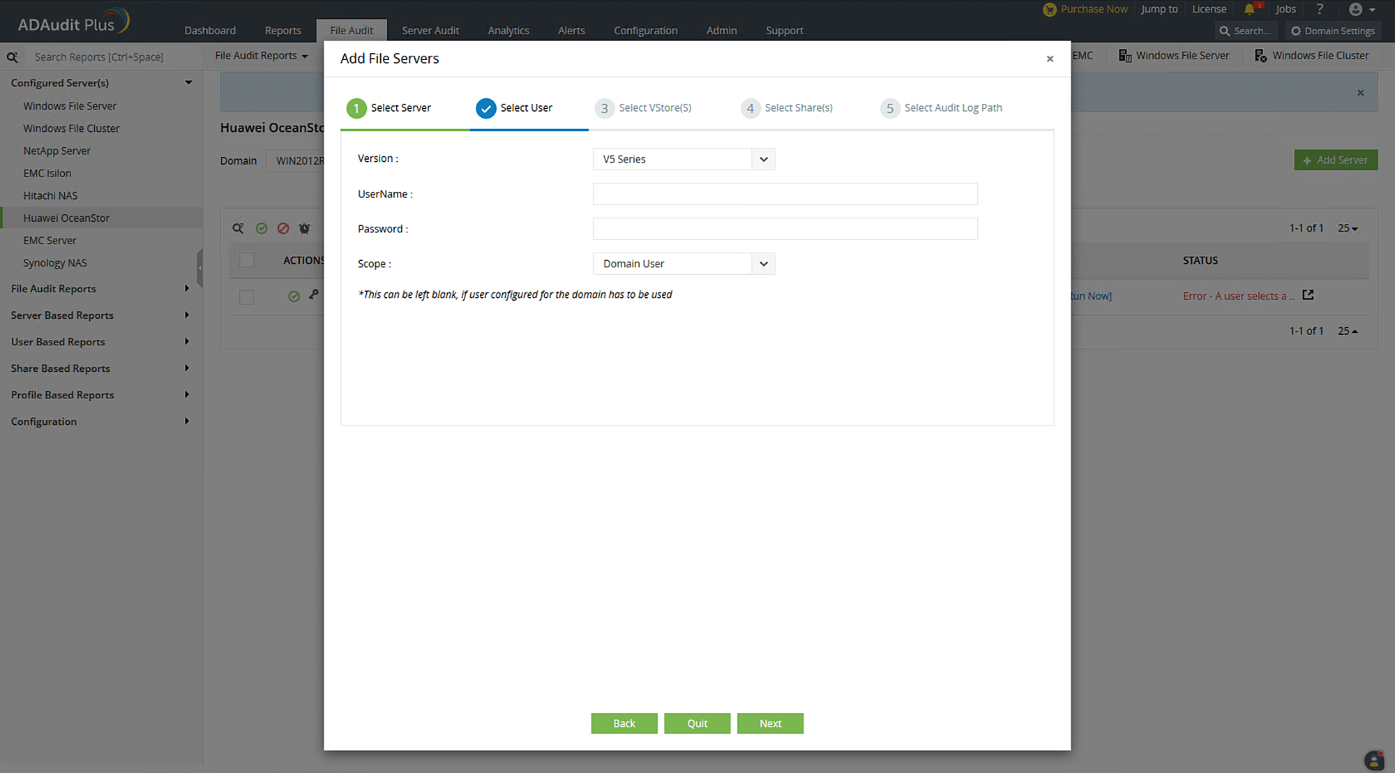 If no vStores are listed, or if only the system or default vStores are listed, check that the ADAudit Plus Huawei user has the required minimum privileges. If the issue persists after the privileges have been assigned correctly, contact the support team at support@adauditplus.com for further assistance.