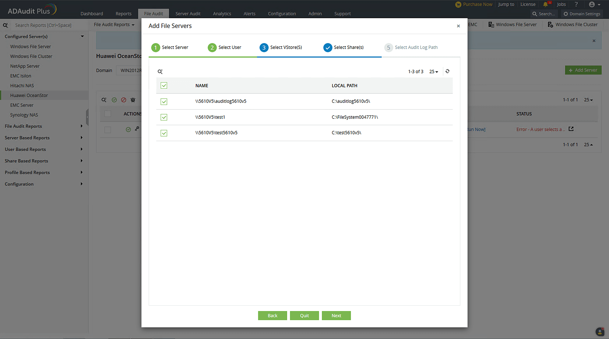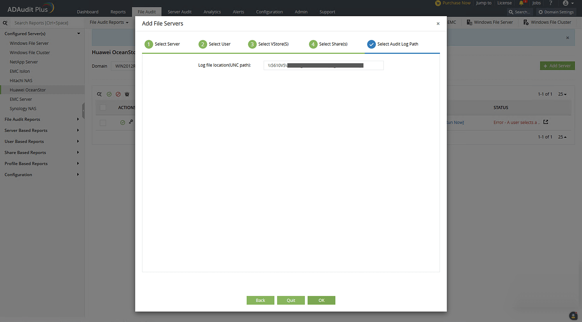 Your target OceanStor storage system will be added to the web console, and ADAudit Plus will begin reporting on access to the target shares.