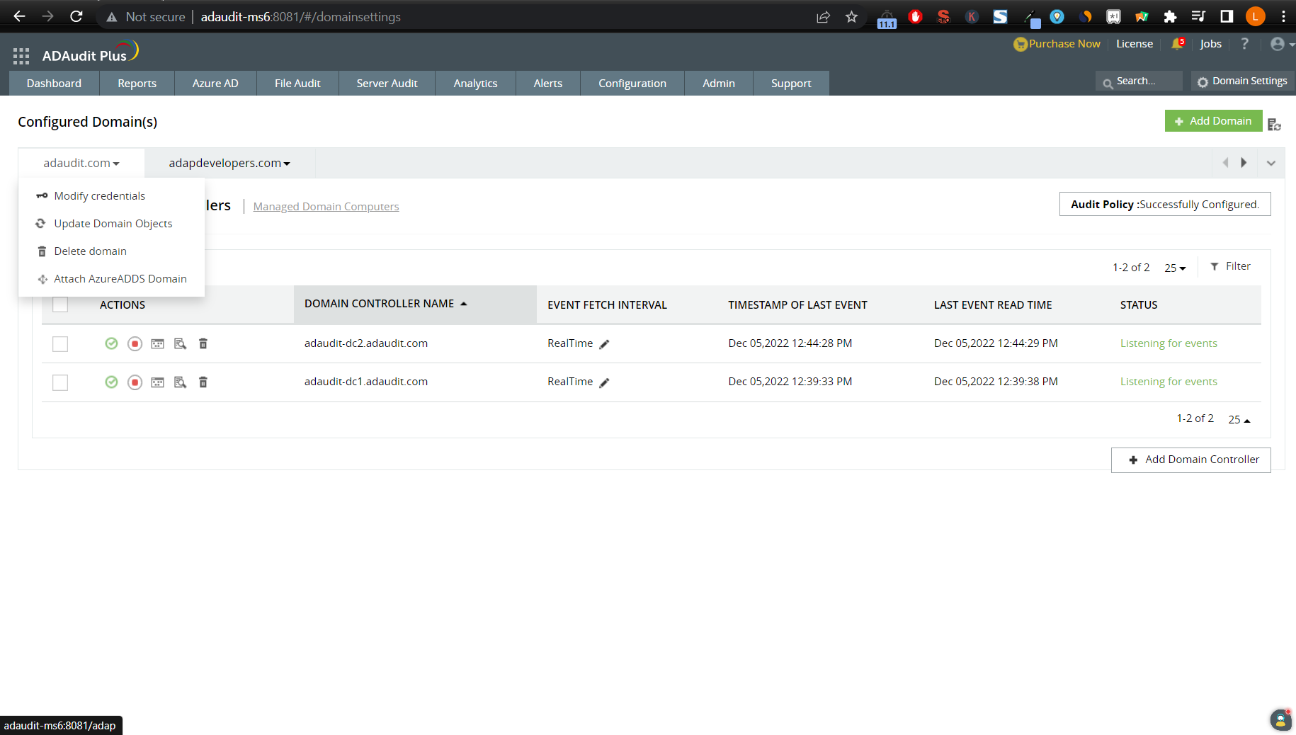 OverviewQuick start System requirementsQuick start PrerequisitesQuick start Deploying ADAudit PlusQuick start Configure components in ADAudit PlusQuick start Related documentationQuick start OverviewActive Directory > Active Directory auditing Configure AD domains and DCs - Automatic configurationActive Directory > Active Directory auditing Configure AD domains and DCs - Manual configurationActive Directory > Active Directory auditing Configure audit policies - Automatic configurationActive Directory > Active Directory auditing Configure audit policies - Manual configurationActive Directory > Active Directory auditing Configure object level auditing - Automatic configurationActive Directory > Active Directory auditing Configure object level auditing - Manual configurationActive Directory > Active Directory auditing Configure event log settingsActive Directory > Active Directory auditing TroubleshootingActive Directory > Active Directory auditing OverviewWindows Server > Removable storage auditing Configure USB AuditingWindows Server > Removable storage auditing TroubleshootingWindows Server > Removable storage auditing OverviewFile Server > Windows file server Supported systemsFile Server > Windows file server Configure Windows file servers - One server at a timeFile Server > Windows file server Configure Windows file servers - In bulkFile Server > Windows file server Configure audit policies - Automatic configurationFile Server > Windows file server Configure audit policies - Manual configurationFile Server > Windows file server Configure object-level auditing - Automatic configurationFile Server > Windows file server Configure object-level auditing - Manual configurationFile Server > Windows file server Configure object-level auditing - Using PowerShell cmdletsFile Server > Windows file server Configure event log settingsFile Server > Windows file server Exclude configurationFile Server > Windows file server File AnalysisFile Server > Windows file server TroubleshootingFile Server > Windows file server OverviewFile Server > EMC server auditing Privileges requiredFile Server > EMC server auditing Adding EMC serversFile Server > EMC server auditing Configure audit policiesFile Server > EMC server auditing Configure event log settingsFile Server > EMC server auditing Automatic configurationFile Server > EMC server auditing Manual configurationFile Server > EMC server auditing Exclusion configurationFile Server > EMC server auditing TroubleshootingFile Server > EMC server auditing OverviewWindows Server > Windows Server Auditing Using product consoleWindows Server > Windows Server Auditing Using command line argumentsWindows Server > Windows Server Auditing Configure audit policies automaticallyWindows Server > Windows Server Auditing Configure audit policies manuallyWindows Server > Windows Server Auditing Remove Apply Group Policy privilege for Authenticated UsersWindows Server > Windows Server Auditing Create a new group, add all Windows servers to the group, and link a GPO to the groupWindows Server > Windows Server Auditing Configure advanced audit policiesWindows Server > Windows Server Auditing Force advanced audit policiesWindows Server > Windows Server Auditing Configure legacy audit policiesWindows Server > Windows Server Auditing Configure event log settingsWindows Server > Windows Server Auditing TroubleshootingWindows Server > Windows Server Auditing OverviewActive Directory > Group policy object auditing Benefits of auditing Group Policy Objects using ADAudit PlusActive Directory > Group policy object auditing Configure domain controllersActive Directory > Group policy object auditing Configure audit controllers - Automatic processActive Directory > Group policy object auditing Configure audit controllers - Manual processActive Directory > Group policy object auditing Configure Object-level auditong - Automatic processActive Directory > Group policy object auditing Configure Object-level auditong - Manual processActive Directory > Group policy object auditing Configure event log settingsActive Directory > Group policy object auditing Install the Group Policy Management ConsoleActive Directory > Group policy object auditing OverviewActive Directory > ADFS auditing Configure AD FS servers in ADAudit PlusActive Directory > ADFS auditing Configure audit policies - Automatic configurationActive Directory > ADFS auditing Configure audit policies - Manual configurationActive Directory > ADFS auditing Configure AD FS servers for auditing - Enable auditingActive Directory > ADFS auditing Configure AD FS servers for auditing - Configure claimsActive Directory > ADFS auditing Configure AD FS servers for auditing - Configure extranet lockoutActive Directory > ADFS auditing TroubleshootingActive Directory > ADFS auditing OverviewWindows workstation auditing Configuring windows workstations - Using product consoleWindows workstation auditing Configuring windows workstations - Using command ine argumentsWindows workstation auditing Configuring audit policies - Automatic ProcessWindows workstation auditing Configuring audit policies - Manual ProcessWindows workstation auditing Configuring event log settingsWindows workstation auditing TroubleshootingWindows workstation auditing OverviewWindows Server > File integrity monitoring Configure FIM in ADAudit PlusWindows Server > File integrity monitoring Configure audit policies - Automatic configurationWindows Server > File integrity monitoring Configure audit policies - Manual configurationWindows Server > File integrity monitoring Configure object-level auditing - Using Windows sharesWindows Server > File integrity monitoring Configure object-level auditing - Using PowerShell cmdletsWindows Server > File integrity monitoring Configure object-level auditing - Using Global Object Access Auditing settingsWindows Server > File integrity monitoring Exclude configurationWindows Server > File integrity monitoring Configuring event log settingsWindows 