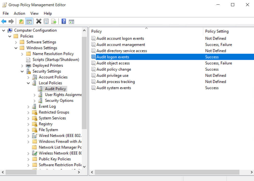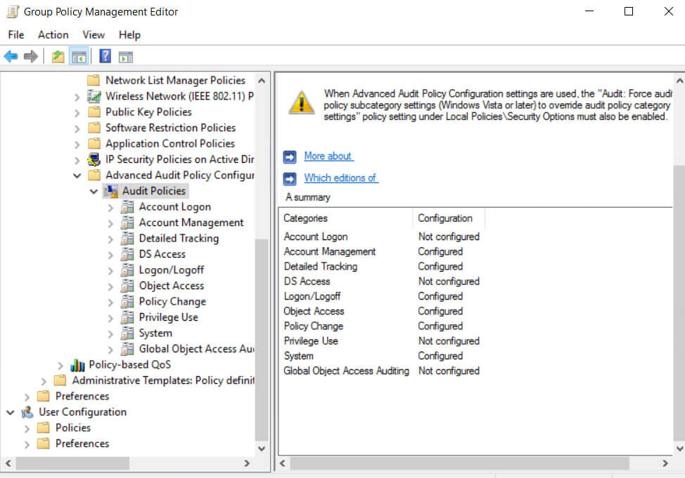 Note:Advanced audit policy configuration is only available in Windows Server 2008 or later. If you have an older version of Windows, configure legacy audit policies. It is recommended that you configure advanced audit policies instead of legacy audit policies to prevent storing needless event data logs, as the legacy policies contain more unwanted events.