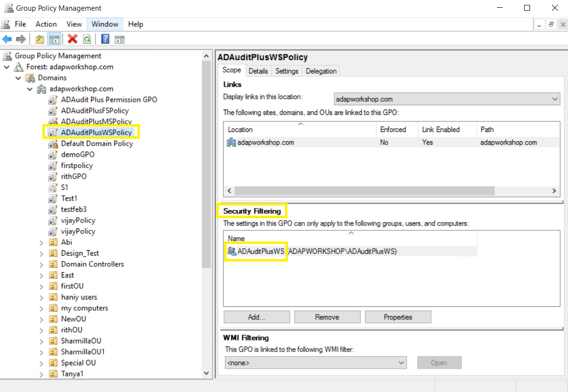 OverviewQuick start System requirementsQuick start PrerequisitesQuick start Deploying ADAudit PlusQuick start Configure components in ADAudit PlusQuick start Related documentationQuick start OverviewActive Directory > Active Directory auditing Configure AD domains and DCs - Automatic configurationActive Directory > Active Directory auditing Configure AD domains and DCs - Manual configurationActive Directory > Active Directory auditing Configure audit policies - Automatic configurationActive Directory > Active Directory auditing Configure audit policies - Manual configurationActive Directory > Active Directory auditing Configure object level auditing - Automatic configurationActive Directory > Active Directory auditing Configure object level auditing - Manual configurationActive Directory > Active Directory auditing Configure event log settingsActive Directory > Active Directory auditing TroubleshootingActive Directory > Active Directory auditing OverviewWindows Server > Removable storage auditing Configure USB AuditingWindows Server > Removable storage auditing TroubleshootingWindows Server > Removable storage auditing OverviewFile Server > Windows file server Supported systemsFile Server > Windows file server Configure Windows file servers - One server at a timeFile Server > Windows file server Configure Windows file servers - In bulkFile Server > Windows file server Configure audit policies - Automatic configurationFile Server > Windows file server Configure audit policies - Manual configurationFile Server > Windows file server Configure object-level auditing - Automatic configurationFile Server > Windows file server Configure object-level auditing - Manual configurationFile Server > Windows file server Configure object-level auditing - Using PowerShell cmdletsFile Server > Windows file server Configure event log settingsFile Server > Windows file server Exclude configurationFile Server > Windows file server File AnalysisFile Server > Windows file server TroubleshootingFile Server > Windows file server OverviewFile Server > EMC server auditing Privileges requiredFile Server > EMC server auditing Adding EMC serversFile Server > EMC server auditing Configure audit policiesFile Server > EMC server auditing Configure event log settingsFile Server > EMC server auditing Automatic configurationFile Server > EMC server auditing Manual configurationFile Server > EMC server auditing Exclusion configurationFile Server > EMC server auditing TroubleshootingFile Server > EMC server auditing OverviewWindows Server > Windows Server Auditing Using product consoleWindows Server > Windows Server Auditing Using command line argumentsWindows Server > Windows Server Auditing Configure audit policies automaticallyWindows Server > Windows Server Auditing Configure audit policies manuallyWindows Server > Windows Server Auditing Remove Apply Group Policy privilege for Authenticated UsersWindows Server > Windows Server Auditing Create a new group, add all Windows servers to the group, and link a GPO to the groupWindows Server > Windows Server Auditing Configure advanced audit policiesWindows Server > Windows Server Auditing Force advanced audit policiesWindows Server > Windows Server Auditing Configure legacy audit policiesWindows Server > Windows Server Auditing Configure event log settingsWindows Server > Windows Server Auditing TroubleshootingWindows Server > Windows Server Auditing OverviewActive Directory > Group policy object auditing Benefits of auditing Group Policy Objects using ADAudit PlusActive Directory > Group policy object auditing Configure domain controllersActive Directory > Group policy object auditing Configure audit controllers - Automatic processActive Directory > Group policy object auditing Configure audit controllers - Manual processActive Directory > Group policy object auditing Configure Object-level auditong - Automatic processActive Directory > Group policy object auditing Configure Object-level auditong - Manual processActive Directory > Group policy object auditing Configure event log settingsActive Directory > Group policy object auditing Install the Group Policy Management ConsoleActive Directory > Group policy object auditing OverviewActive Directory > ADFS auditing Configure AD FS servers in ADAudit PlusActive Directory > ADFS auditing Configure audit policies - Automatic configurationActive Directory > ADFS auditing Configure audit policies - Manual configurationActive Directory > ADFS auditing Configure AD FS servers for auditing - Enable auditingActive Directory > ADFS auditing Configure AD FS servers for auditing - Configure claimsActive Directory > ADFS auditing Configure AD FS servers for auditing - Configure extranet lockoutActive Directory > ADFS auditing TroubleshootingActive Directory > ADFS auditing OverviewWindows workstation auditing Configuring windows workstations - Using product consoleWindows workstation auditing Configuring windows workstations - Using command ine argumentsWindows workstation auditing Configuring audit policies - Automatic ProcessWindows workstation auditing Configuring audit policies - Manual ProcessWindows workstation auditing Configuring event log settingsWindows workstation auditing TroubleshootingWindows workstation auditing OverviewWindows Server > File integrity monitoring Configure FIM in ADAudit PlusWindows Server > File integrity monitoring Configure audit policies - Automatic configurationWindows Server > File integrity monitoring Configure audit policies - Manual configurationWindows Server > File integrity monitoring Configure object-level auditing - Using Windows sharesWindows Server > File integrity monitoring Configure object-level auditing - Using PowerShell cmdletsWindows Server > File integrity monitoring Configure object-level auditing - Using Global Object Access Auditing settingsWindows Server > File integrity monitoring Exclude configurationWindows Server > File integrity monitoring Configuring event log settingsWindows 