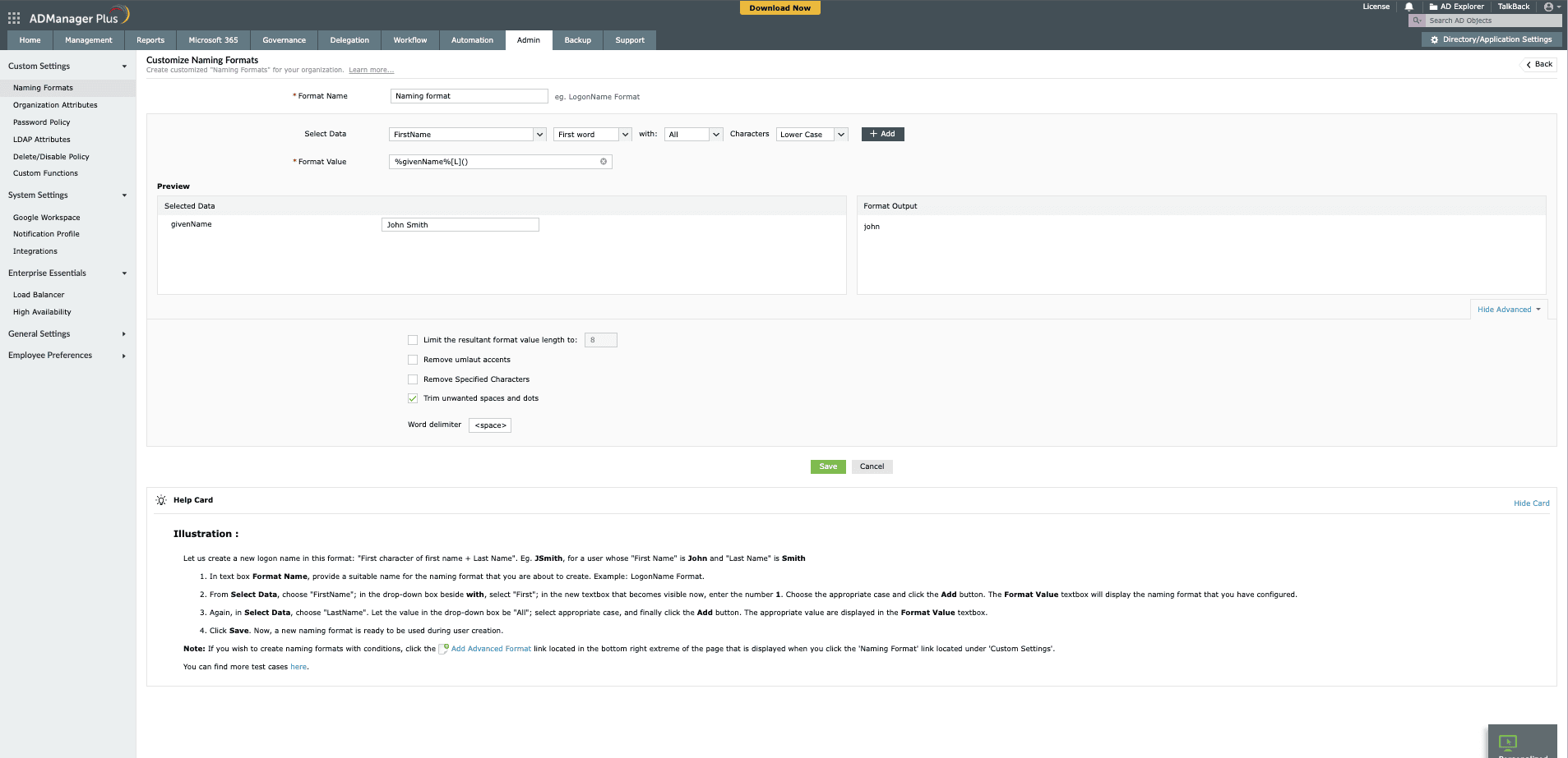 - Reactive naming formats: Define flexible naming conventions that automatically adjust based on available user data, ensuring consistent and accurate user account names.