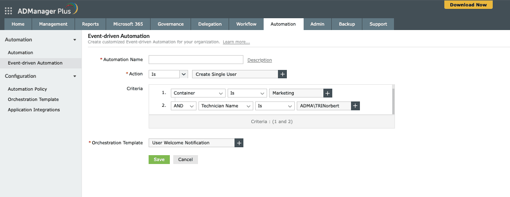 - Event-driven automation: Create event-driven automations that are triggered by specific actions and can perform a sequence of actions. Unlike scheduled automations that run at predetermined times, orchestration responds dynamically to events like user creation, modification, or deletion.