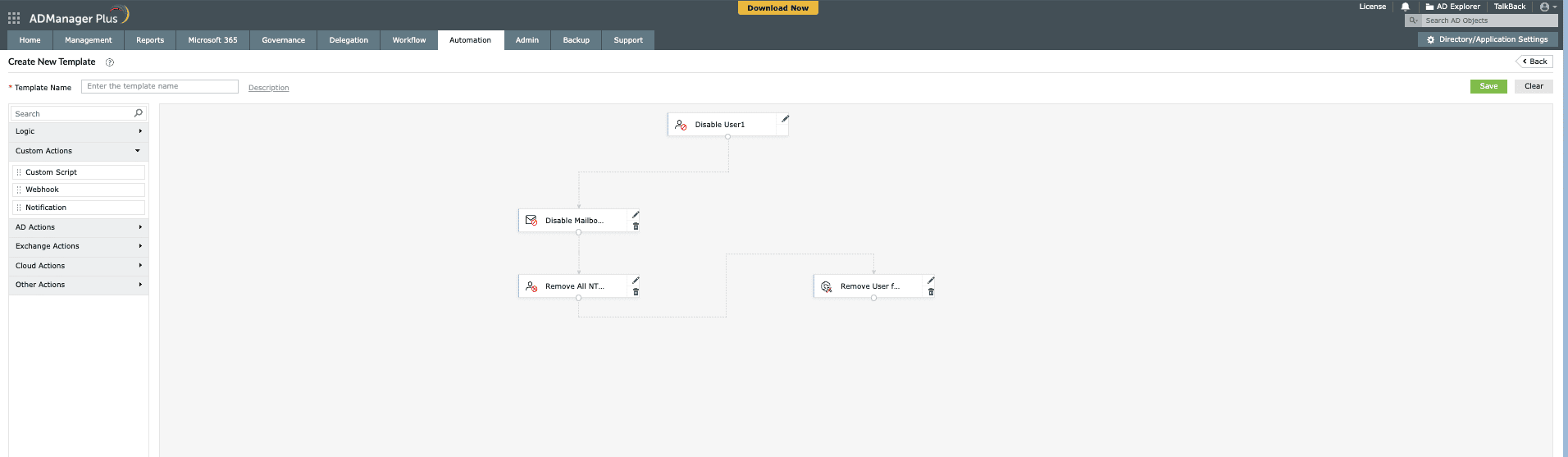 Unlike solutions that require extensive knowledge of AD automation scripts (like PowerShell), ADManager Plus offers a library of prepackaged actions and scenarios. This eliminates the need for manual scripting and allows you to: