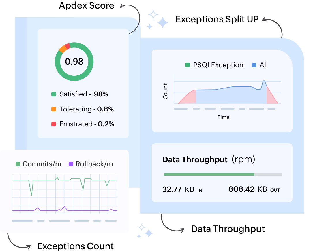 - Optimize database usage: Track query invocation frequency, throughput, SQL time, and error rates to optimize database performance.