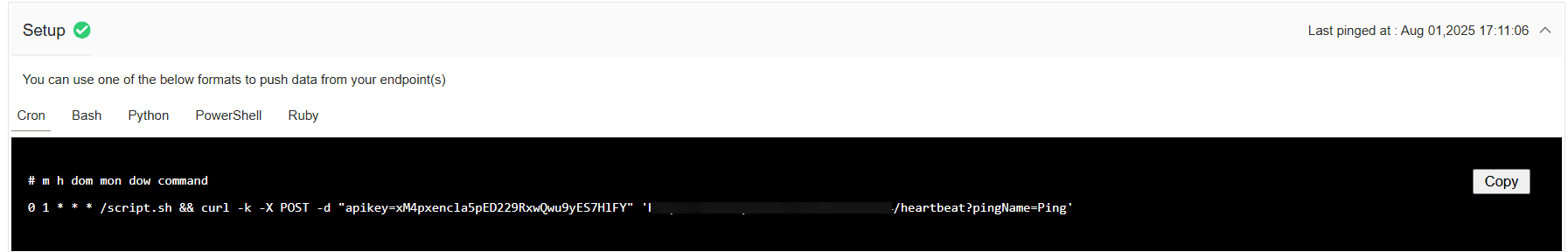 Heartbeat Monitoring is a basic yet powerful monitoring type designed to confirm that a target system (such as a server or a service endpoint) is up and actively reporting. It generates alerts not only when a ping is missed, but also when one is received prematurely or unexpectedly, enabling the detection of system malfunctions, configuration errors, and other anomalous behavior. The monitored resource periodically sends a heartbeat signal to Applications Manager, confirming that it is active and operating within the defined timeout interval. Upon creating a Heartbeat monitor, a unique ping URL and an authentication key will be generated, that can be effortlessly integrated into your service. This allows you to trigger heartbeat signals using any of the supported formats listed below: