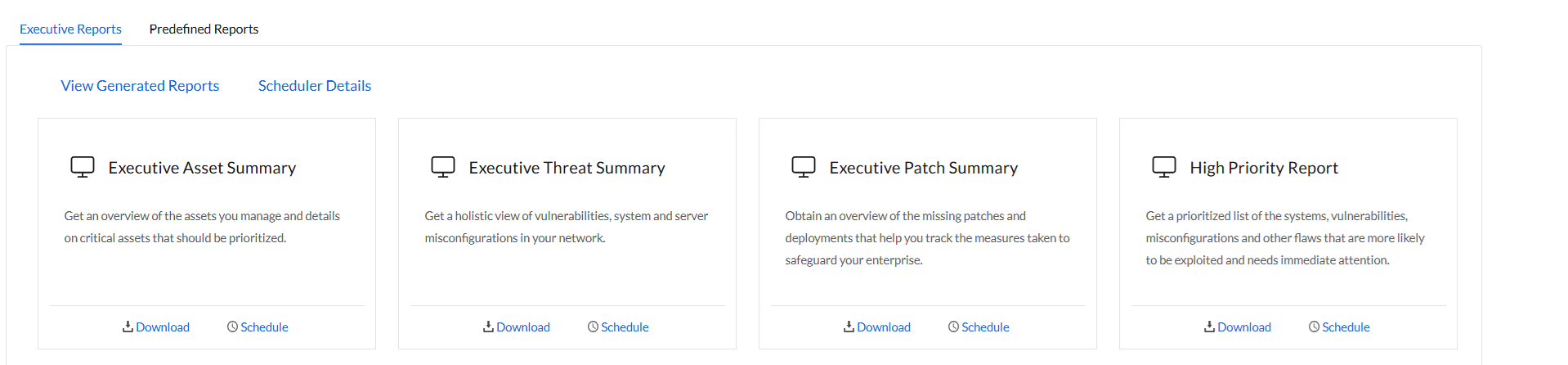 The Executive Reports are generated and submitted to the top leadership staff for in-depth analysis of their network. They are configured by Endpoint Central, which can be further scheduled or exported according to the requirement. The different executive reports are as follows: