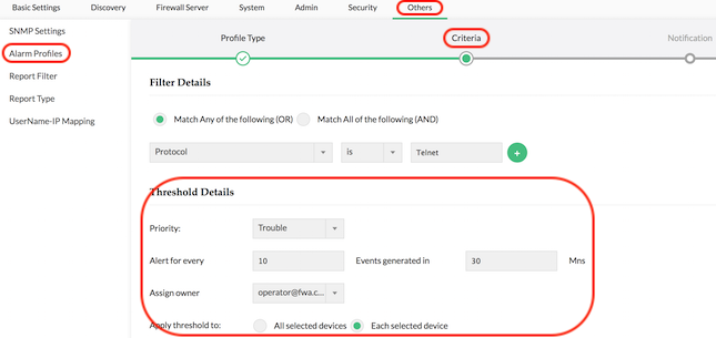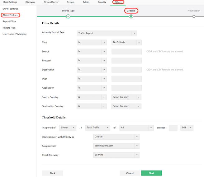 Alerts can be set up for each device that Firewall Analyzer monitors. You can choose the exact criteria to trigger the alert, set the priority of the alert, and finally set up an email notification or any other notification to immediately notify IT when the alert is triggered.
