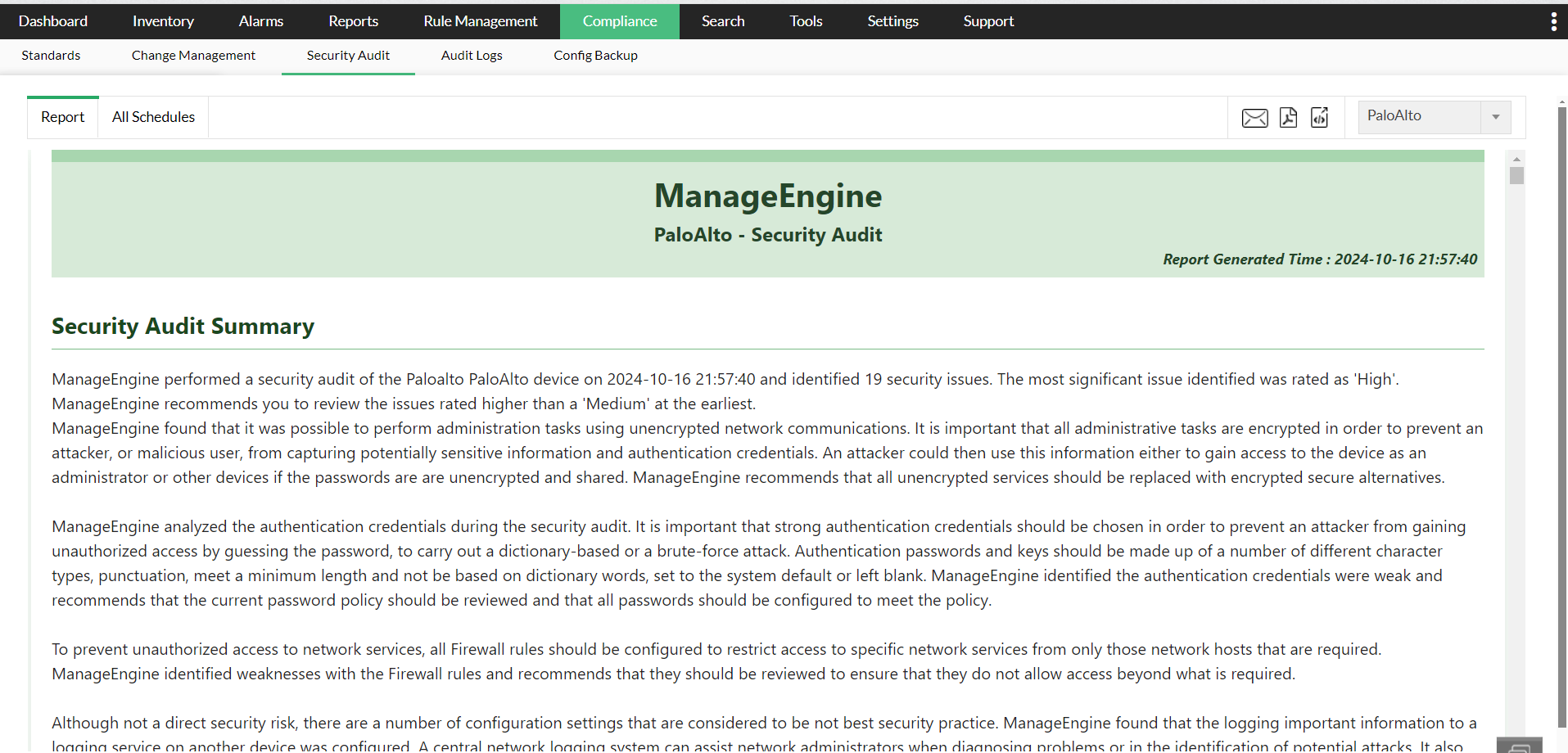 - Instant Firewall Compliance report generation: Users can generate compliance reports on demand.