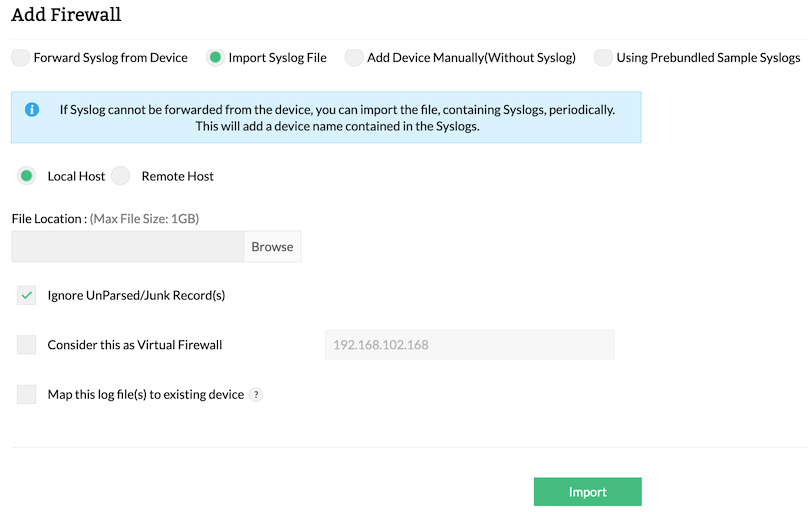 • Log records imported from local host. Protocol: HTTP, Max File Size: 1 GB. If the log records are imported from local server (where Firewall Analyzer is running), there is no maximum file size limit.