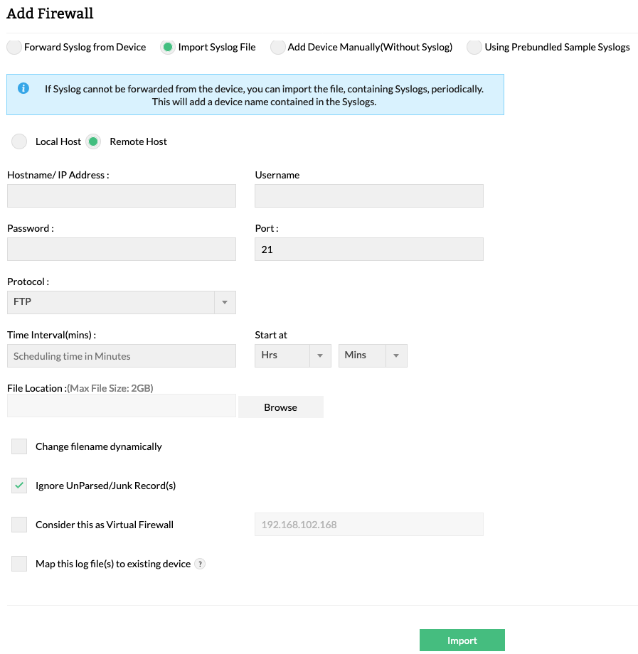 • To import log from another machine using localhost option, you can share the folder of the another machine and map that shared folder as network drive of localhost. You can schedule the log import for this also.