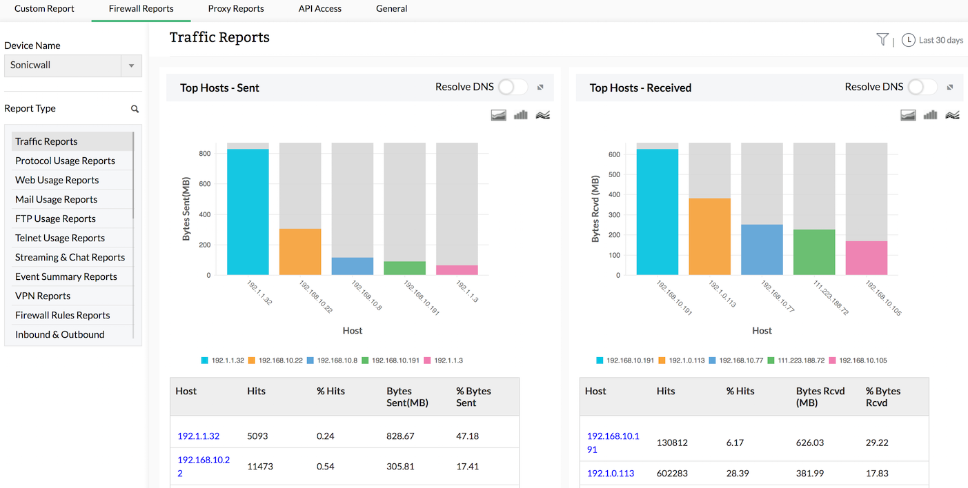 Enable 'IPFIX with extensions' flow reporting in SonicWALL next generation firewalls (running on SonicOS v5.8.x platform) and configure the firewall to direct the flows to Firewall Analyzer. Both Static flows and Dynamic flows from SonicWALL are 'collected' by Firewall Analyzer, which then analyzes the received flows and generates a variety of network traffic and security reports.