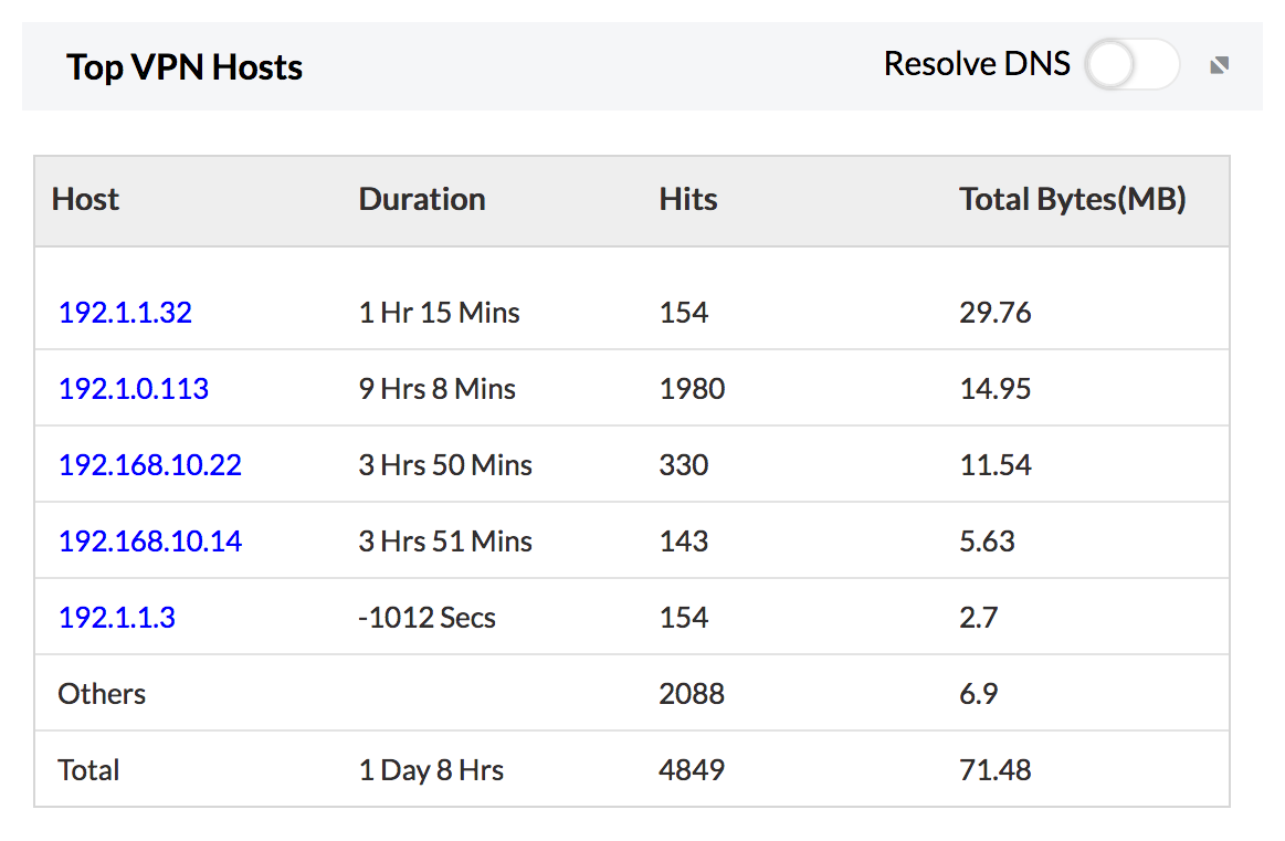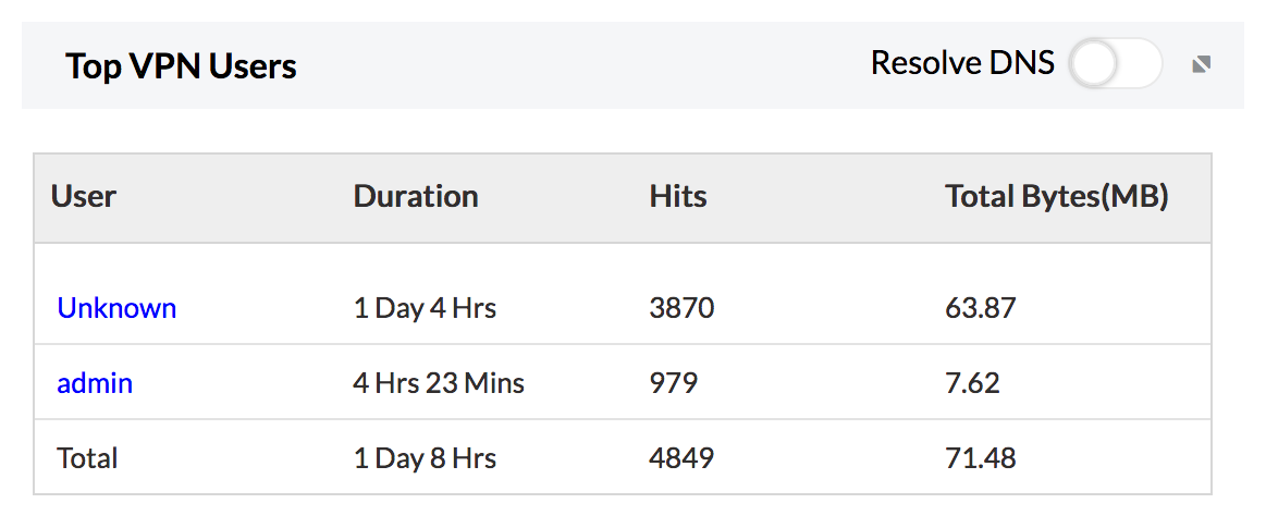 Top VPN users reports will be very handy if you have Remote Host VPNs configured in your environment. It basically gives you the users connected to your VPN and the amount of traffic consumed by them.