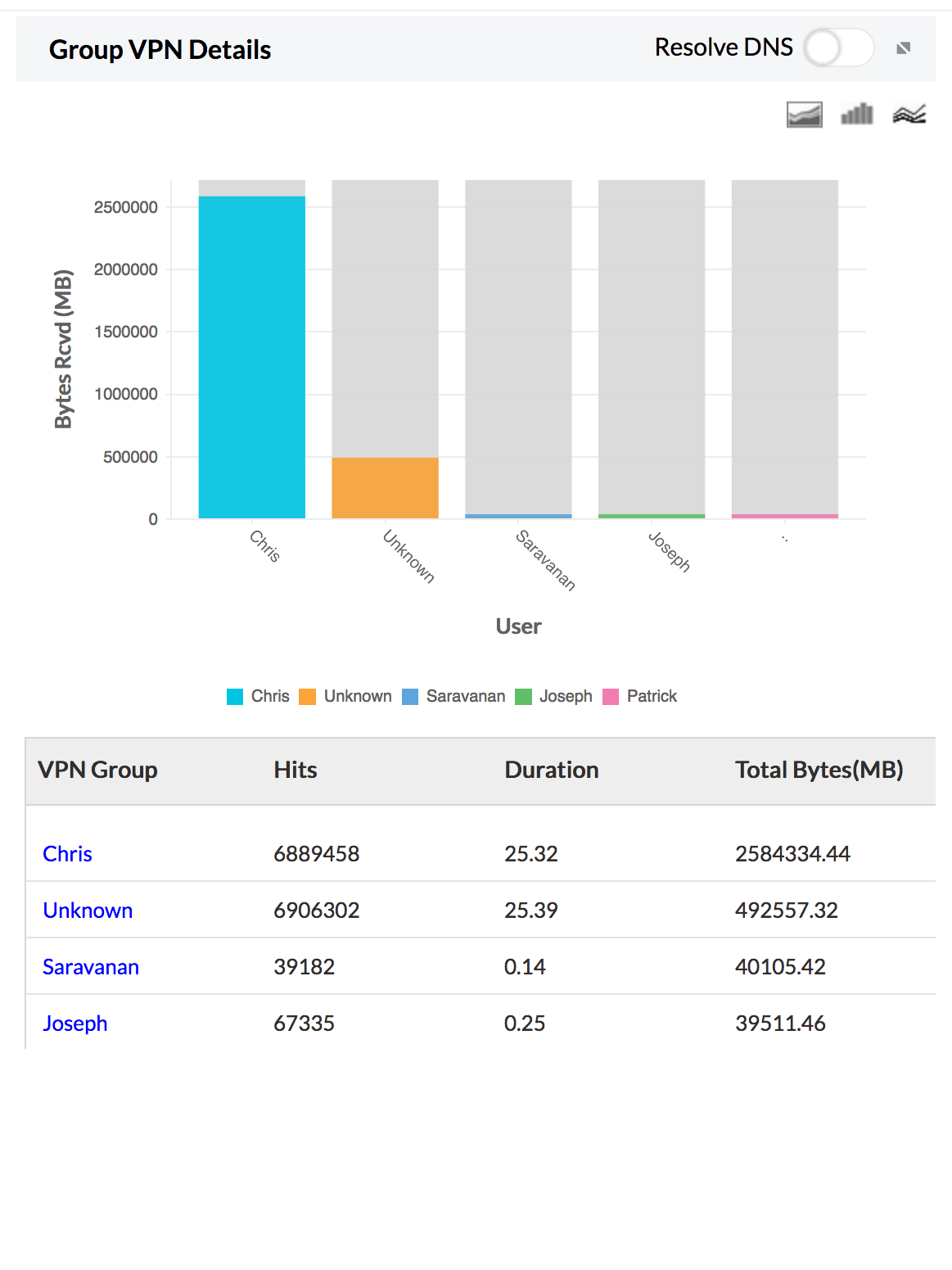 Provides VPN usage details for a group of users with details on number of hits, duration of usage, and total bytes of VPN traffic.