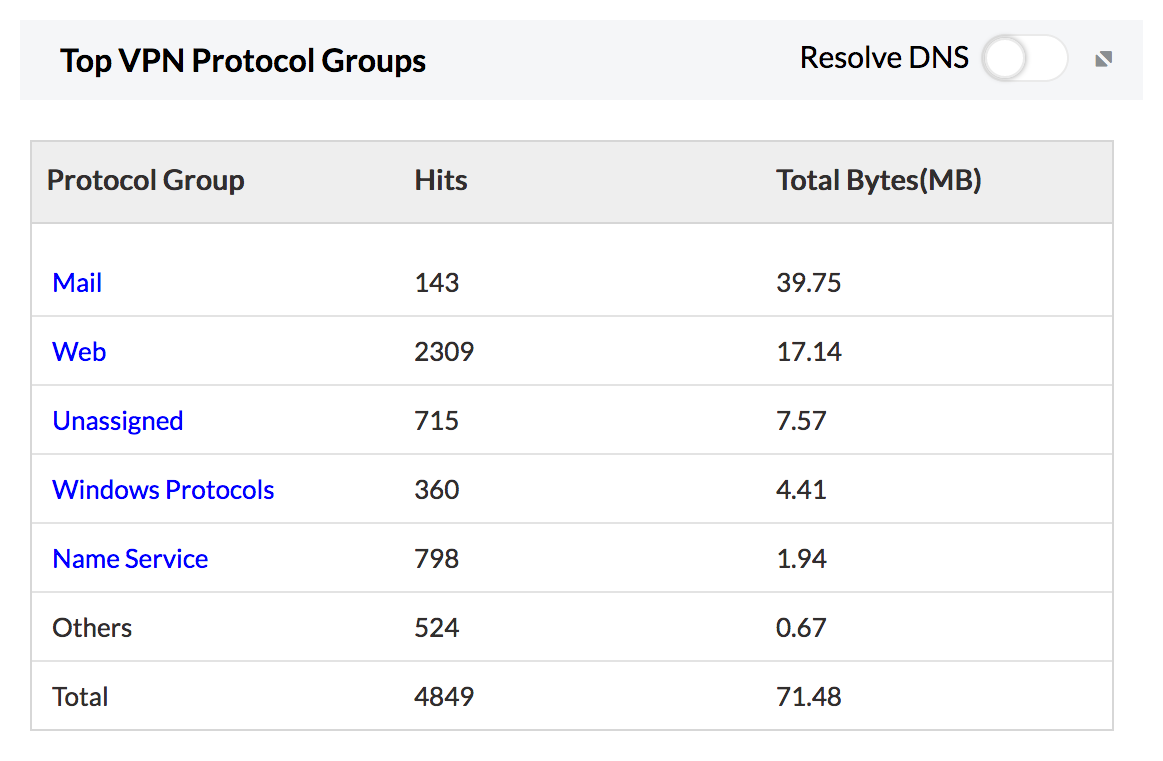 Top Protocol Groups, gives you an overview of what kind of protocol is used in your VPN network. This will be very useful in the case of Site To Site VPN. Some firewalls produce application layer protocol information in the VPN logs and some might not. For the firewalls that are producing protocol information in the logs, this report can give excellent insights.